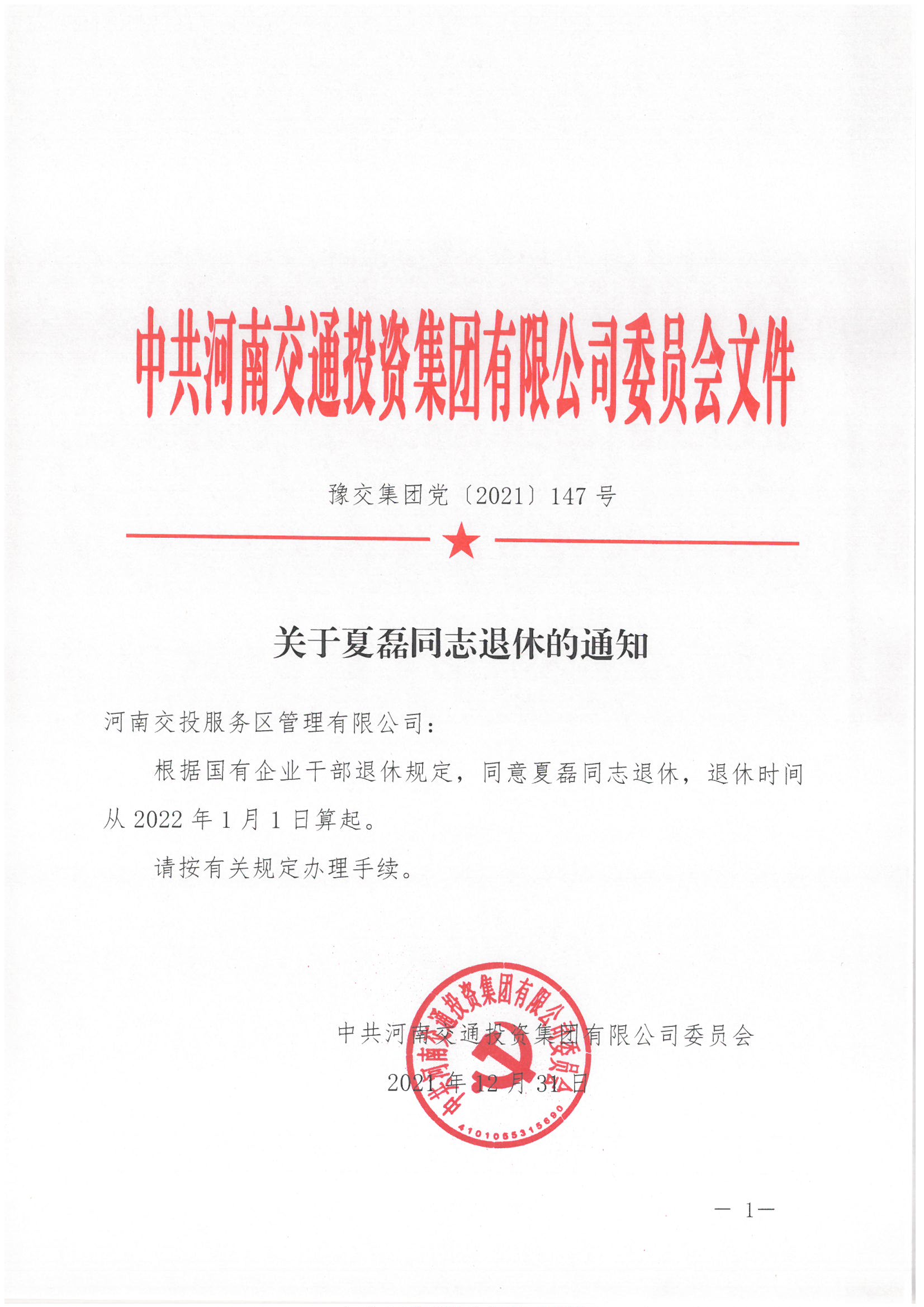 關于夏磊同志退休的通知