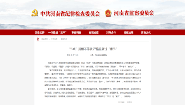 2月7日,省紀(jì)委監(jiān)委網(wǎng)站工作動態(tài)基層風(fēng)采專欄以題為《節(jié)點”提醒不停歇 嚴(yán)格監(jiān)督過“廉節(jié)”》對服務(wù)區(qū)公司紀(jì)委開展節(jié)前提醒和節(jié)日期間監(jiān)督工作進(jìn)行報道。