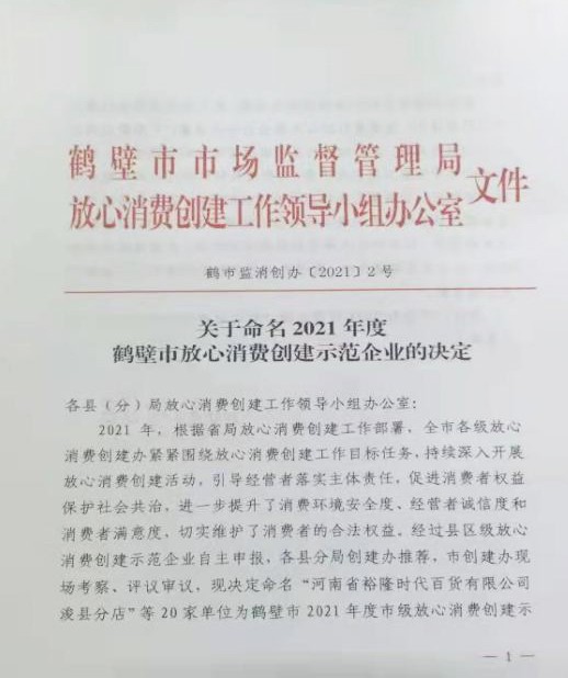 鶴壁服務區榮獲“鶴壁市放心消費創建示范企業”、“淇縣放心消費創建示范單位”榮譽稱號