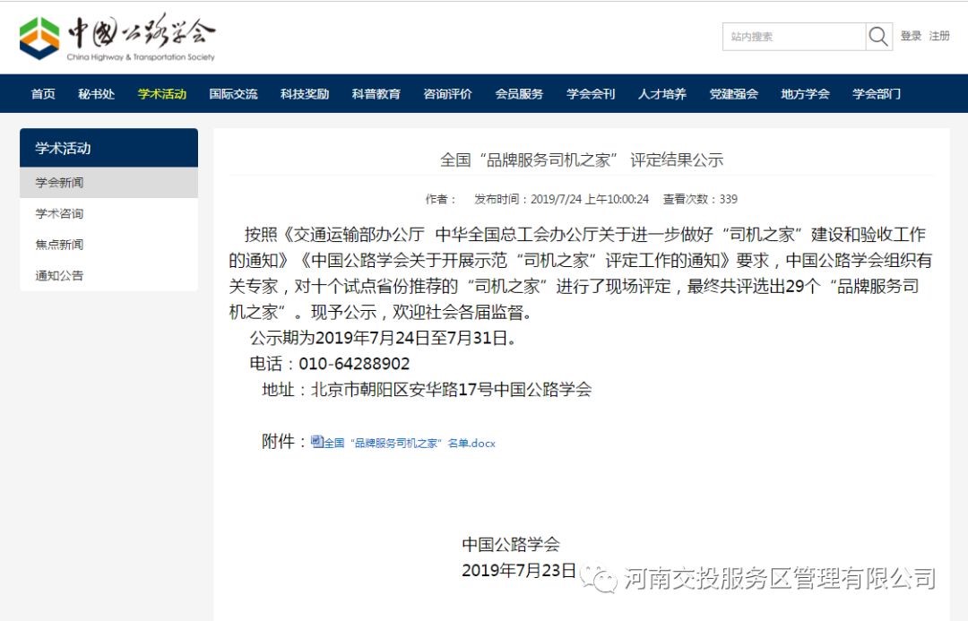 安陽服務區“司機之家”被評為2019年全國“品牌服務司機之家”