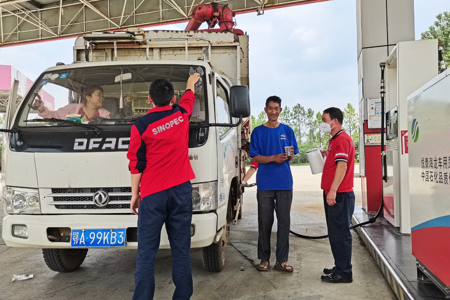 息縣服務(wù)區(qū)加油站設(shè)置專(zhuān)用加油通道,為機(jī)收車(chē)輛駕駛員送上飲用開(kāi)水,幫助擦拭車(chē)輛玻璃。