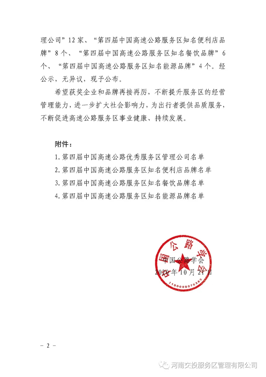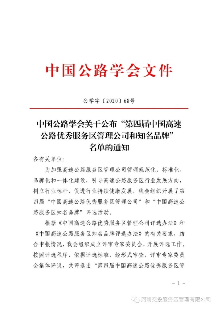 近日,由中國公路學會組織開展的第四屆“中國高速公路優秀服務區管理公司”和“中國高速公路服務區知名品牌”評選活動已圓滿結束,按照評選程序及標準,經形式審查,評審專家委員會集體評議,共評選出12 家“第四屆中國高速公路優秀服務區管理公司”,河南交投服務區管理有限公司名列其中,喜獲殊榮。下一步,公司將在集團的正確領導下,不忘初心、再接再厲,持續提升服務區的經營管理能力,切實為出行者提供品質服務,不斷促進高速公路服務區事業健康、持續發展。