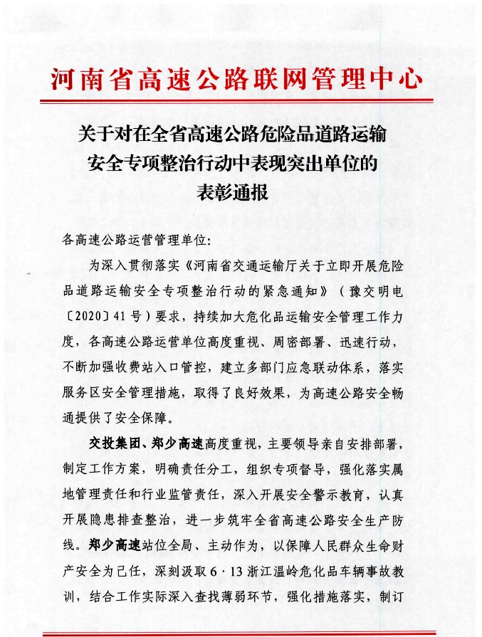 來源: 本站 發(fā)布時間: 2020-07-02近期,公司在全省高速公路危險品道路運輸安全專項整治活動中表現(xiàn)突出,省高速公路聯(lián)網(wǎng)管理中心對公司高度重視、周密部署,多舉措抓好抓實安全生產(chǎn)工作,給予了充分肯定,并對交投集團、公司及所屬鄭州北服務(wù)區(qū)全省通報表彰! 6月24日,河南省政府副省長、省公安廳廳長舒慶一行…