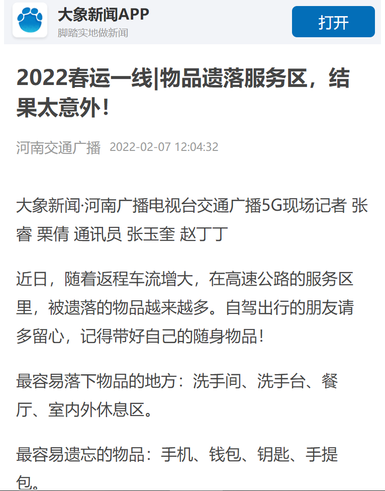 來源: 本站 發(fā)布時(shí)間: 2022-02-152022年2月15日,中國服務(wù)區(qū)以題為《服務(wù)區(qū)的春運(yùn)日記》對(duì)服務(wù)區(qū)公司所屬禹州服務(wù)區(qū)好人好事進(jìn)行報(bào)道。網(wǎng)址:https://mp.weixin.qq.com/s/Wwrysb43la-cs5NL8dnR7w截圖: