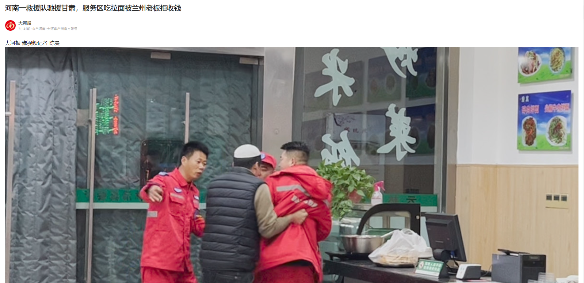 來源: 本站 發布時間: 2023-12-2012月18日23時59分,甘肅臨夏州積石山縣發生6.2級地震。12月19日,河南省夏邑縣斑馬救援隊7名隊員前往震區救援,在三門峽服務區,一行人下車到服務區外包清真餐廳吃飯,老板怎么都不愿意收錢,雙方拉扯的視頻被拍下上傳網絡,十分感人。12月20日7時,大象新聞發布相關抖音短視頻…