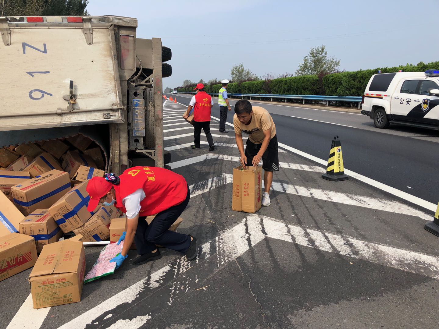 9月15日,夏邑服務區值班經理在途徑南區下道口巡查時突然聽見一聲巨響,尋聲遠望發現下道口上坡處的高速路上兩車相撞,便立即向現場跑去,并撥打電話安排工作人員帶上錐形標前來救援。事故現場一輛貨車車頭損壞,另一輛貨車側翻,所載貨物散落一地,一位駕駛員左臂擦傷,流血不…